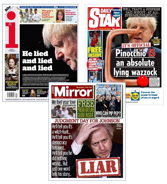 Not all UK newspapers were as brutal to Boris, but they still made the point that he was a liar who had to go. (below)