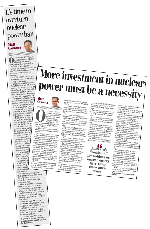 The nuclear (political) war raged on a few days later when on Saturday and apropos of pretty much nothing the Liberal National Party senator from Queensland, Matt Canavan, continued the campaign with columns in The Courier-Mail and The Daily Telegraph in Sydney. (below)