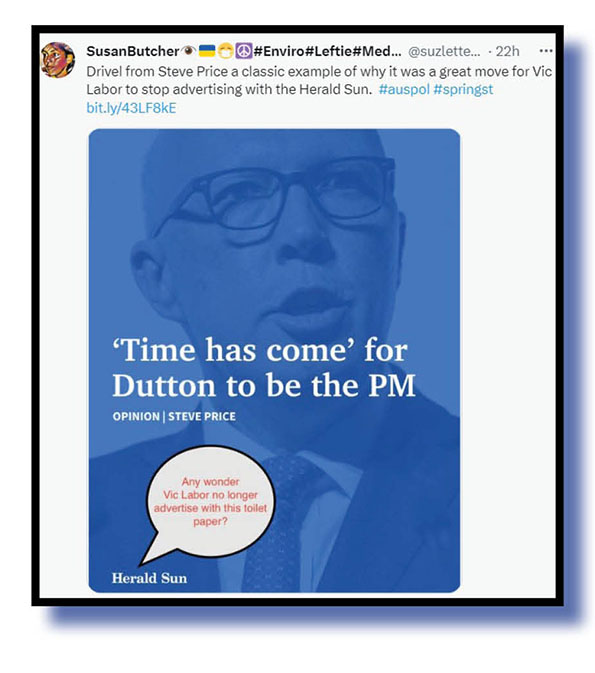 And you can’t get anything much funnier than a Steve Price opinion piece. So our joint winners this week are Miss Polly and Susan Butcher etc, etc, bloody etc (at top and below) for their pithy observations on a Price article in the Herald Sun that tried to make a loveable lamb of a leader out of Dutton.