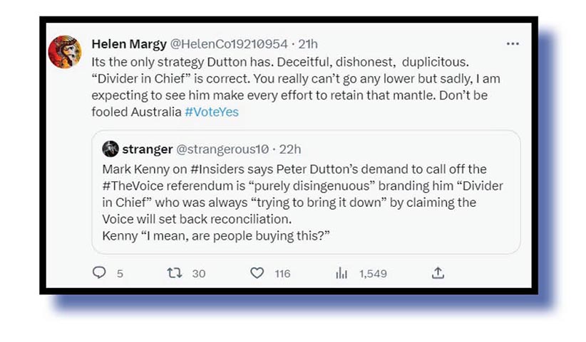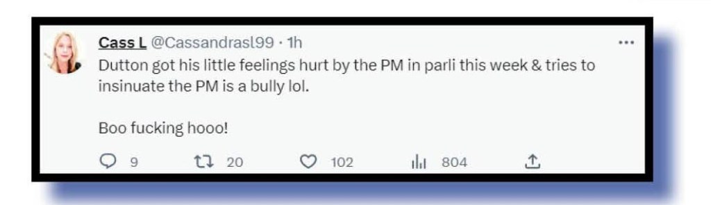 Now, apart from the real fear that our readership will drop off at the mere mention of his name, Peter Dutton was the subject of some cruel comments over the past week, none more acerbic than Helen Margy in conversation with stranger, Terry Serio and Cass L.