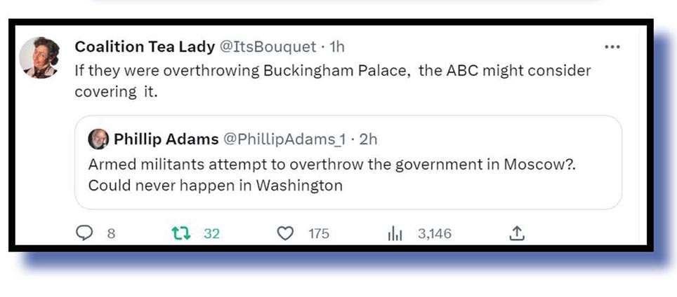 The ABC’s tardiness in response to the attempted coup in Russia caught the sarcastic eye of Coalition Tea Lady, in a response to Phillip Adams, and The Emperor’s Old Tailor.