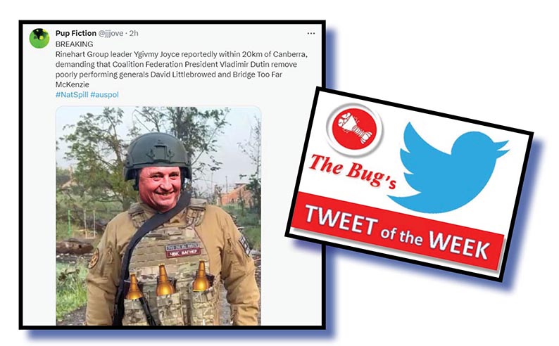 Our tweets-of-the-week judges couldn’t go past this fine effort (at top and below) from Pup Fiction. Rinehart Group leader! Rolled gold, from the get-go.