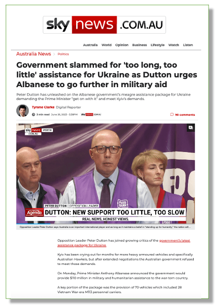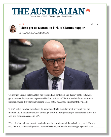 It carried a story uploaded just after 1.00pm telling readers that Dutton had “repeated his confusion and dismay” at the Albanese Government’s decision not to send Hawkei armoured vehicles to Ukraine.