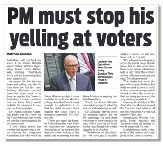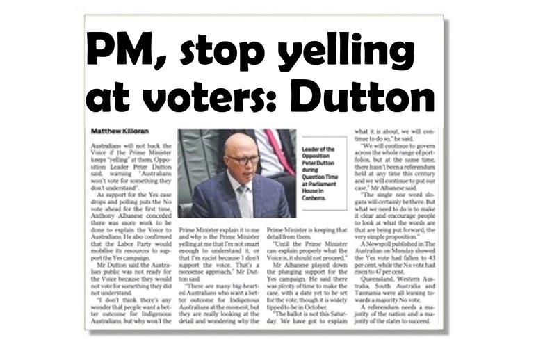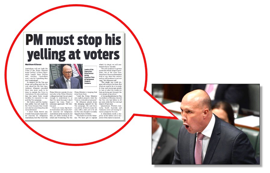Just take a look at the item that appeared in Monday’s paper based on comments by Dutton critical of Prime Minister Anthony Albanese for “yelling” at voters when prosecuting the “yes” case for a First Nations’ voice to federal parliament. (below)