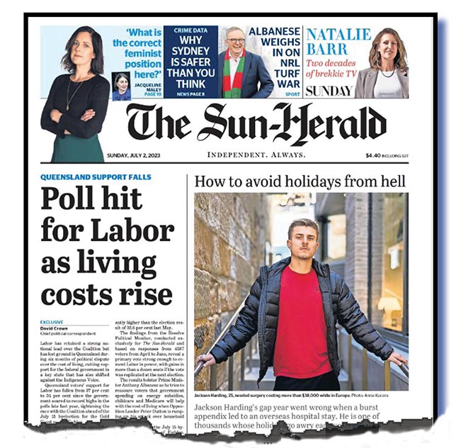 So what did our subeditor concentrate on; a focus, to be fair, driven by the slant Crowe possibly gave his piece? That Queensland voters’ support for Labor has fallen from 37 per cent to 34 per cent “since the government soared to record highs in the polls late last year, tightening the race with the Coalition ahead of the July 15 byelection for the Gold Coast seat of Fadden”.