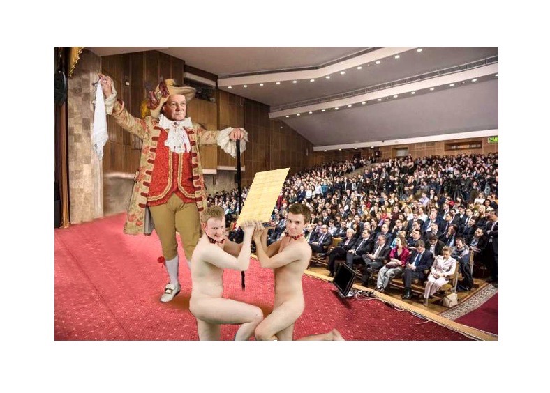 His Lordship then tapped his gold-capped black-ivory swagger stick on the stage, at which two naked under-footmen entered and held a parchment containing his latest column published earlier this week. (main picture)