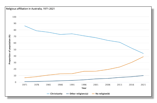 The top blue line in the graph charts the alarming downward trend between 1971 and 2021 in the percentage of our Australian population identifying as Christians in each five-yearly Census.