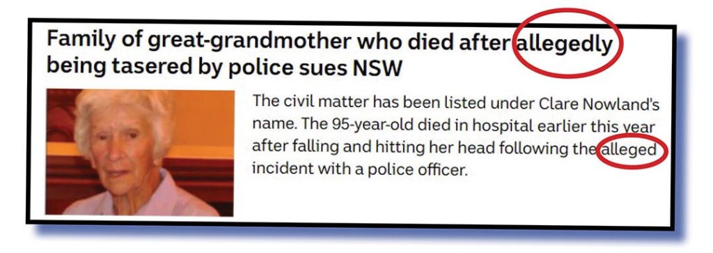 The NSW Police Commissioner made it very clear shortly after this dreadful unalleged incident at the aged care facility that Clare was zapped by the copper. The use of the taser was never, ever, in doubt. The strings were attached.