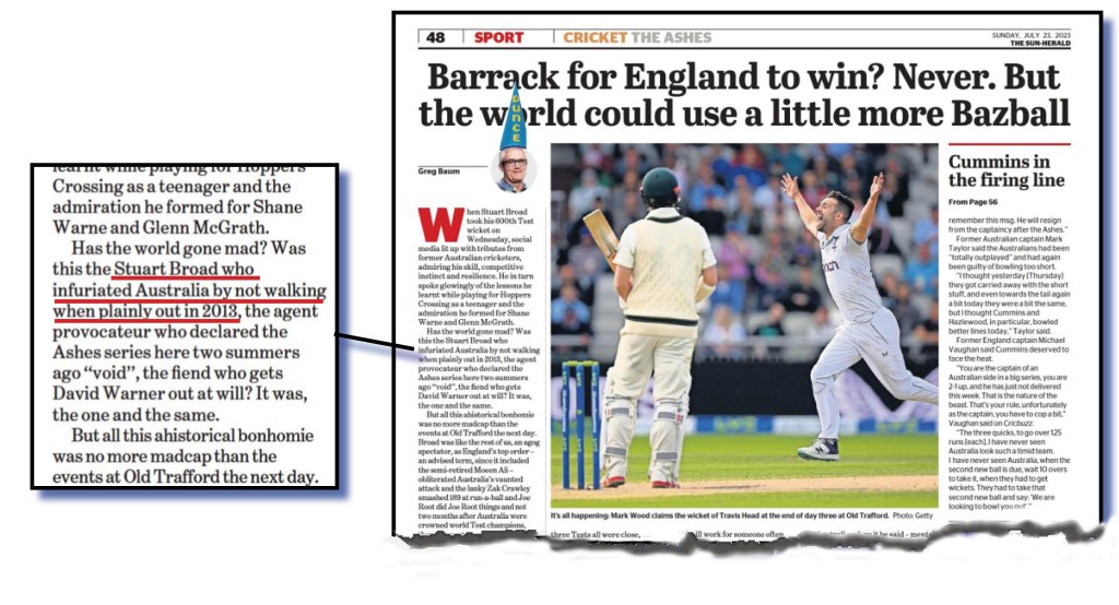 We could give Baum the benefit of the doubt and agree that the “Australia” Broad had infuriated were the Australian players – who admittedly on the day at Trent Bridge were livid in their hypocrisy – but we’ll show him no quarter and suspect he’s referring to the Australian public in general.