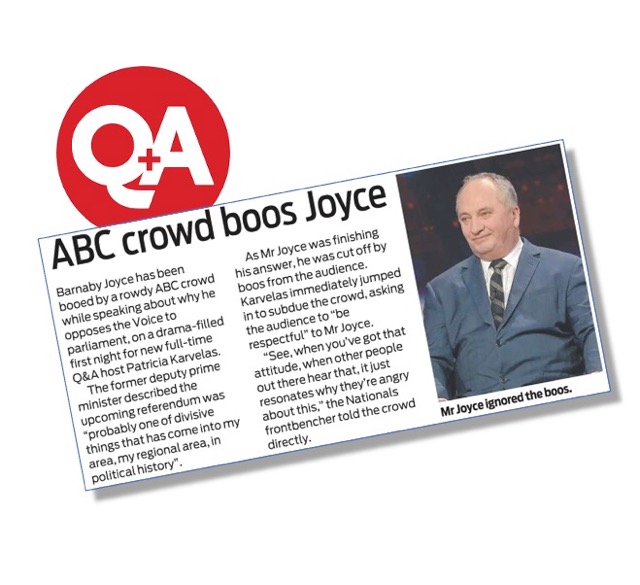 Producers of ABC TV’s weekly public discussion program Q&A say Barnaby Joyce was warned before appearing on this week’s episode about a likely hostile response from some members of the studio audience. (main picture)