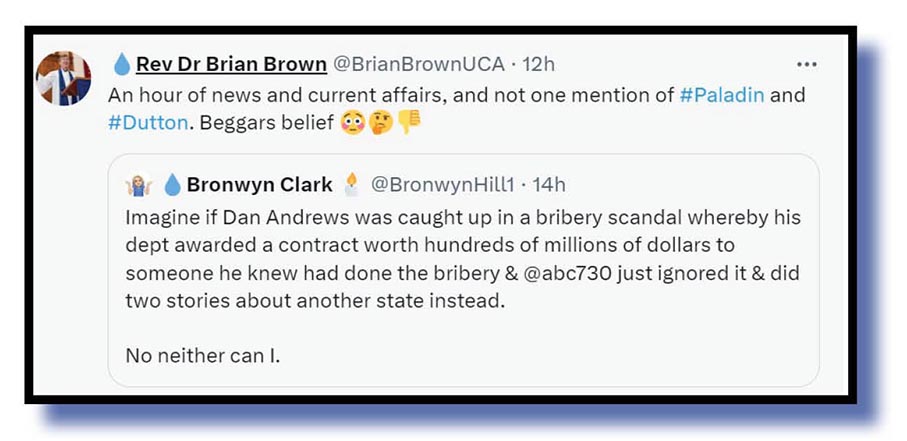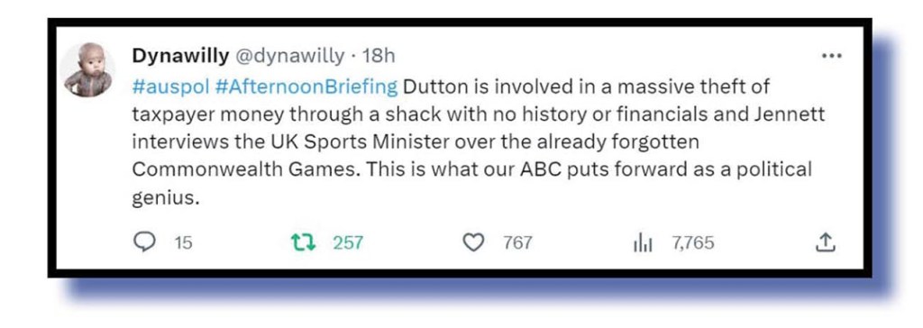 The Bug‘s tweets barrel was chockablock this week, as usual, with attacks on perceived political bias by the ABC on a number of issues and across its various platforms. Typical were these offerings from Rev Dr Brian Brown, Dynawilly, Peter Murphy and The Big Ship etc, etc, #Yes23