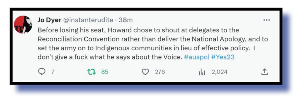 … while Jo Dyer made it clear what she thought of John Howard’s contribution to the Voice debate.