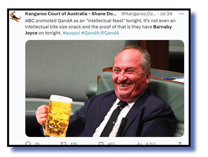 Appearing almost like clockwork on another ABC TV platform the next night was Barnaby Joyce who got Rick and Kangaroo Court of Australia, etc, etc, going.