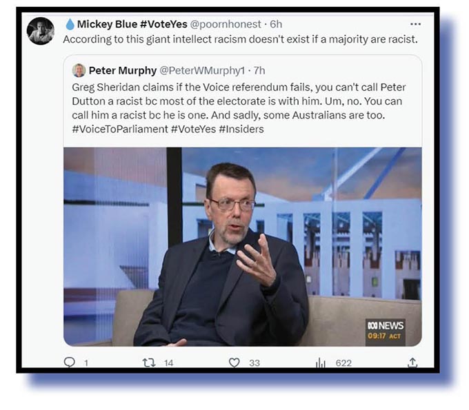 There’s always Twitterverse outrage whenever Greg Sheridan appears on ABC Insiders so let’s hear from Mickey Blue #VoteYes and MFW.
