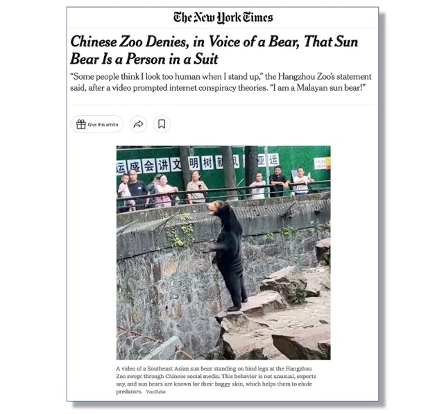 Chinese Government authorities have hit back at viral online stories circulating in the past few days that claimed a sun bear at the Hangzhou Zoo in Zhejiang Province might be a human dressed in a bear suit. (below)