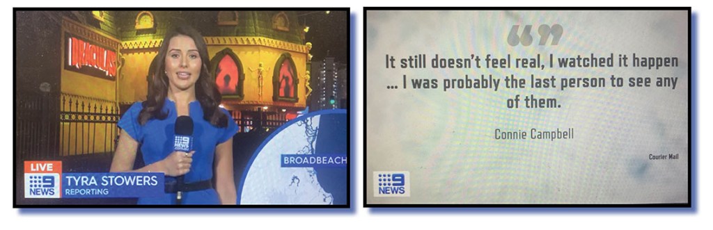 And we’re talking about the embarrassingly long nine seconds that the image below lobbed on and dominated the screen halfway through a report on a fire that had cleared Dracula’s cabaret venue in Broadbeach on the Gold Coast.