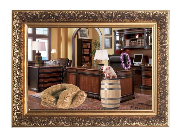 “The portrait is dominated by a huge turd lying in an office, which I have included as a subtle visual clue to the fact that Morrison will always be remembered as being a huge lying turd in office.
