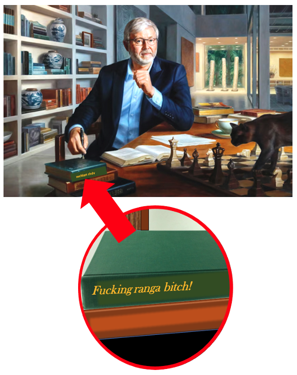 But a keen-eyed visitor to Parliament House has also noticed a possible reference to another prime minister, Julia Gillard, in the title of a book Heimans included on the desk in front of Rudd in the portrait. (below)