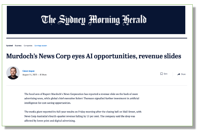 While the Murdoch family-controlled global media company News Crap has formally announced plans to embrace artificial intelligence (AI) in its production processes to cut costs (below), it can be revealed that its local subsidiary News Crap Australia has been experimenting with the cutting-edge technology for years.