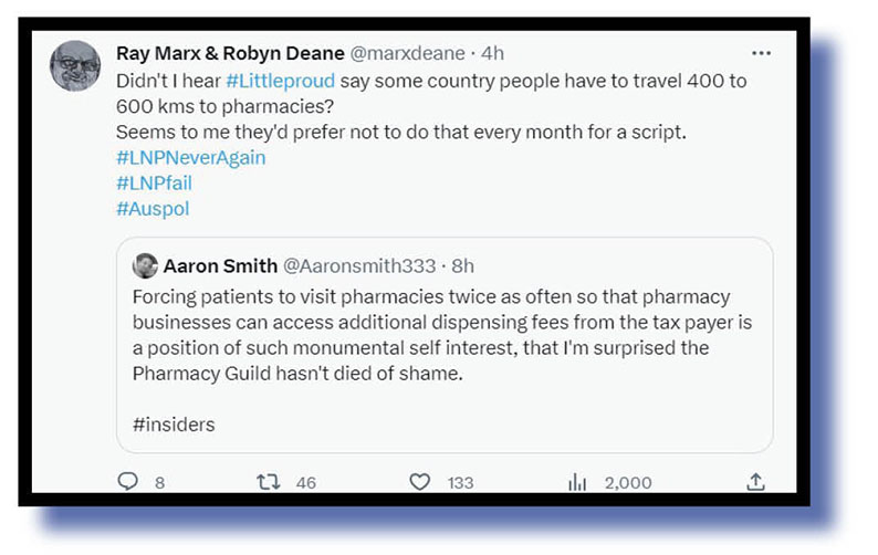 …while Ray Marx & Robyn Deane, in a response to Aaron Smith, introduced a nice little piece of logic that’s quite possibly beyond Littleproud’s thinking-things-through abilities. Still, maybe he should have been able to do that, seeing the Nationals’ No 1 priority is every-day country and regional folk! (insert prolonged and loud canned laughter here!)
