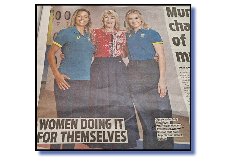 Titmus, at right in that photo, didn’t rate a mention in the blocklines. The three ladies were named as, and we’re assuming it was left to right because that’s what real newspapers used to do, Olympic surfer Sally Fitzgibbons, Paralympian Montana Atkinson and Harvey Norman chief Katie Page.