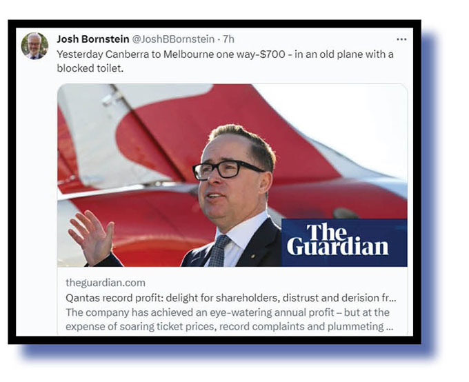 Josh Bornstein provided this timely observation on a thankfully short if expensive and smelly flight with a record-profit-making Qantas…