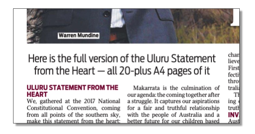 So, what does News Crap Australia do? It publishes – in what some readers might think is good faith – three turdbloid pages containing what it says is the Uluru Statement from the heart. (below)