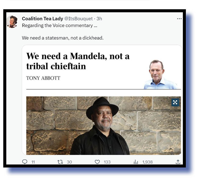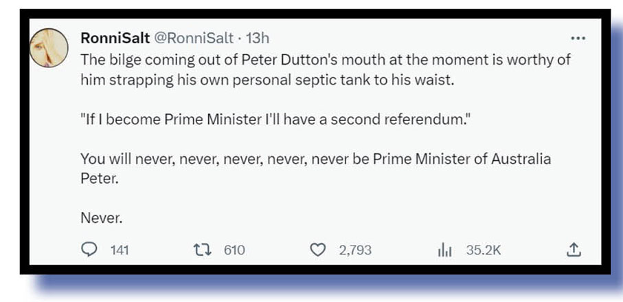 Sad, isn’t it? All this would have been avoided if the Liberal Party had backed The Voice instead of seeing some political advantage that The Bug is absolutely sure does not, and will never, exist from defeating this referendum with the LNP’s lie-ridden mixture of smear and fear. Or put another way, if Dutton thinks he’s going to get any advantage whatsoever if this goes down the way he wants, especially in the Teal and independent seats he lost in 2022, well then he’s even more fucking stupid than he looks and sounds.