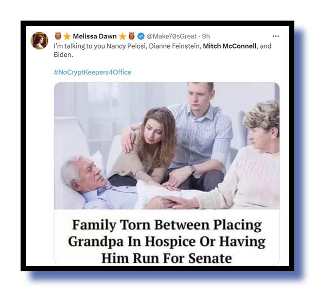 They thank Melissa Dawn (at top and below) for this wonderful meme inspired, we assume, by Mitch O’Connell’s latest brain freeze in Washington and Joe Biden on the world stage continuing to look like he’s only days away from needing a walking frame.