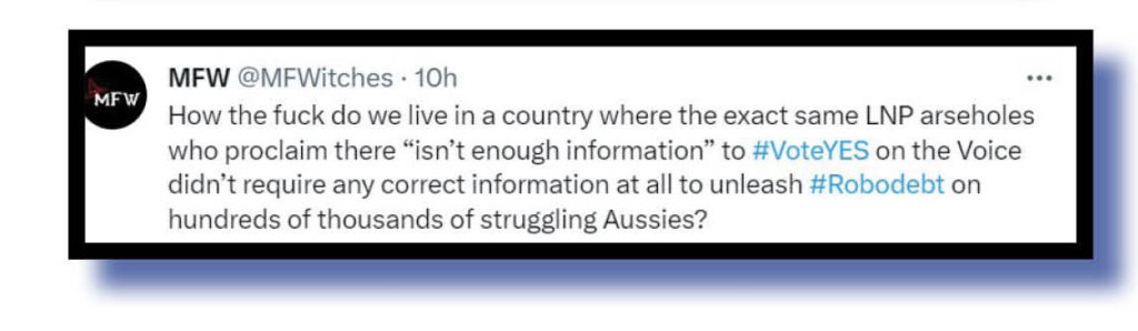 Dan Fan Girl etc Vote yes exposed just one part of the Liberals’ hypocrisy on this whole Voice argument while MFW connected the Robodebt dots.