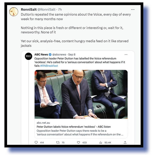 RonnieSalt pondered why Dutton keeps getting so much media for the shit that pours relentlessly from his gob and we gave her a second helping for attacking this nation’s deplorable mainstream mediocre in allowing that to happen.