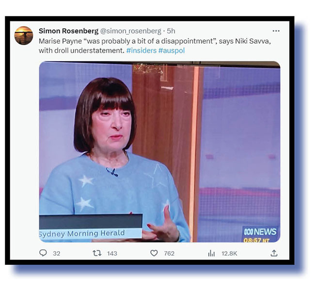 … while Simon Rosenberg saw merit in Niki Savva’s reflections on the political career of Marise Payne.