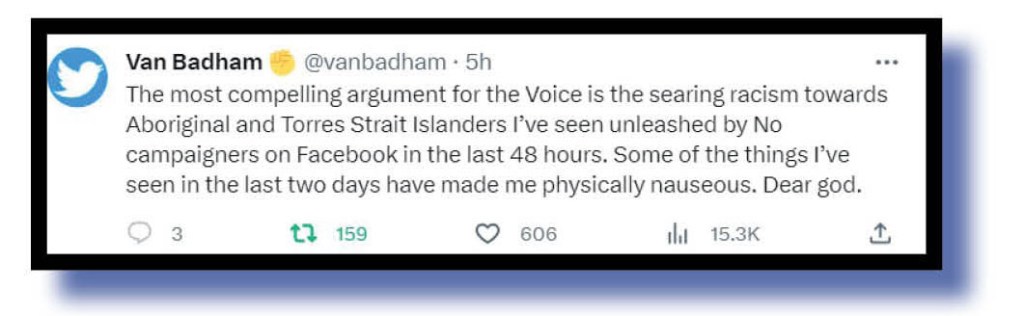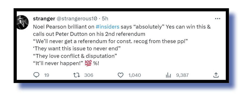 Stranger had praise for Noel Pearson who scoffed at Dutton’s brainfade notion of a second referendum, while Van Badham called out the racism now being shown to our first Nations people on social mediocre.