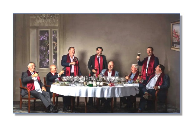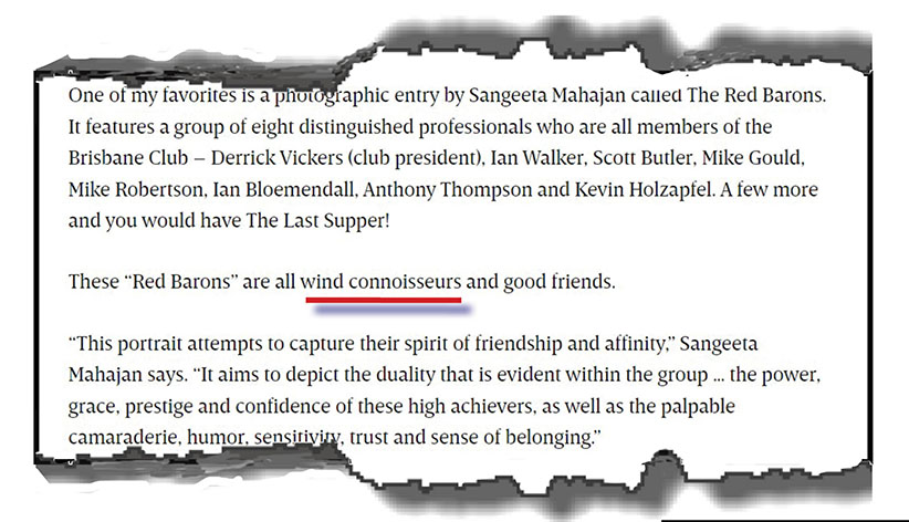 After admitting that he is the subject of one of the paintings on this year’s shortlist, Brown tells readers that one of his favourites in the shortlist is a photographic entry by Sangeeta Mahajan called The Red Barons featuring eight male members of the Brisbane Club. (below)
