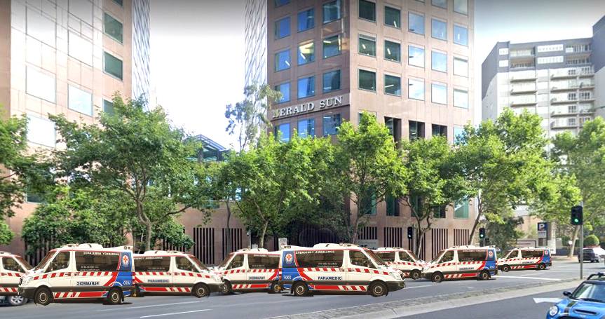 A News Crap Australia source said ambulances were called to the company’s Southbank headquarters (main picture) as staff began collapsing during the meeting called by Herald Sun editor Sam Weir to discuss this week’s sudden resignation of Dan Andrews as Victorian Premier.