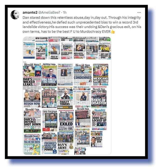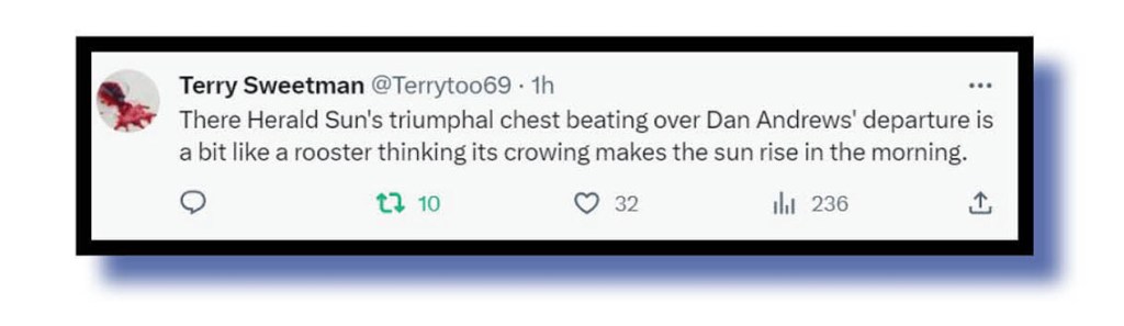 Bewdiful put down of the Herald Sun and the role it played in Andrews’ two landslide victories in 2018 and 2022. Ah, the power of Newscorpse to influence election results. Spooky.