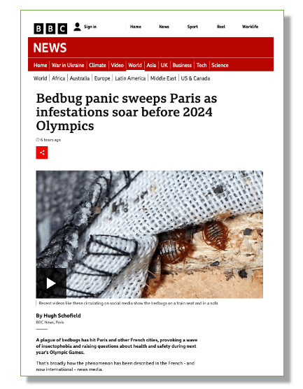 Organisers of the 2024 Paris Olympic Games say they have settled on a novel solution to the threat posed to the event by the plague of bed bugs infesting the city. (below)