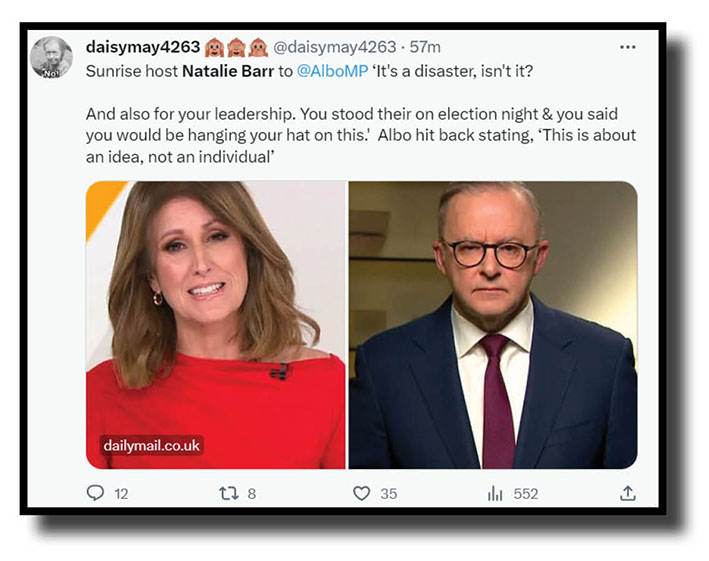 And why? Natalie Barr’s grilling of PM Albanese is the perfect example of how the great bulk of this nation’s woeful mainstream mediocre is going to act after the likely defeat of the Voice referendum: a savage, vicious and unrelenting attack on Albanese with no other purpose than to vindicate Peter Dutton’s decision to oppose the Voice and to do what it can to turn his belief that there are votes to be gained and accommodation at The Lodge to be had from taking that stand.
