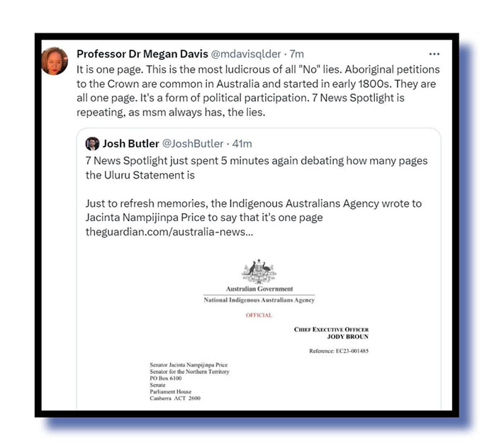 Here’s Professor Dr Megan Davis and Josh Butler in discussion over the Seven network Spotlight program’s attempts to fan the flames of dissent over an issue that should have been dead, buried and cremated long ago – the number of pages in the Uluru statement from the heart.