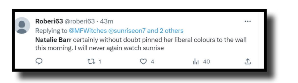 Speers ran the exact same rubbish on Friday’s News Breakfast and by not immediately criticising it there and then as well, he allowed the clear impression to form that he believed her comments had some merit and/or weight. Is that a fair assessment of where you stand, David?
