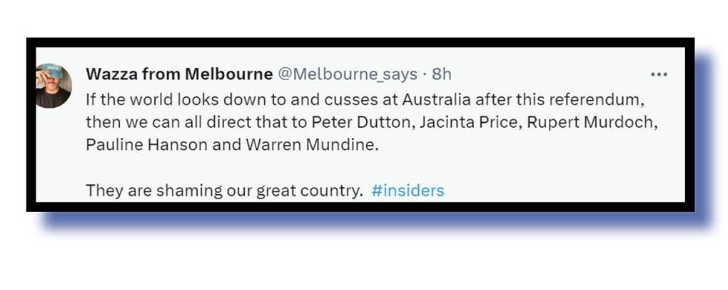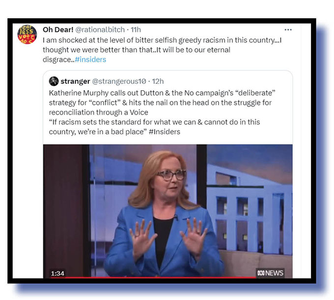 And, finally, if this referendum is heading for defeat as the polls suggest, let’s end on a positive note with the wise observations of Insiders panelist Katherine Murphy, whose comments were amplified by amante2, Oh Dear! in conversation with stranger, and many others on social media over recent days.