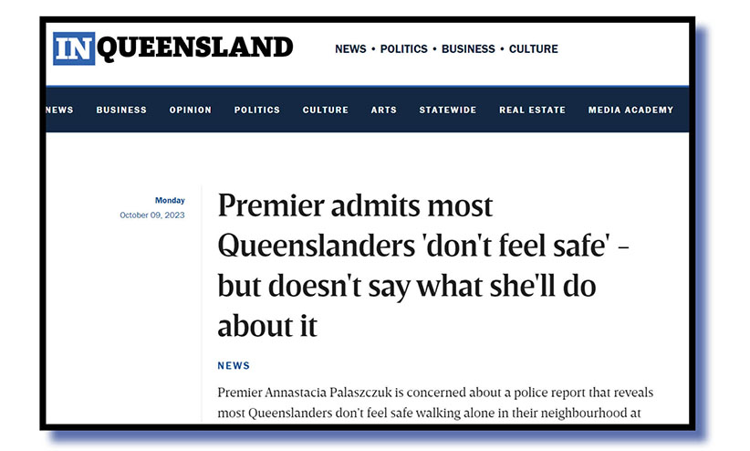 Anyone is entitled to be scared walking around at night but that 2022/23 QPS annual report internal did not disclose a significant turnaround in those feeling afraid at stepping out at night. And no Premier worth their salt would see those results and eagerly agree with the general notion implied in that heading that Queenslanders generally no longer feel safe.