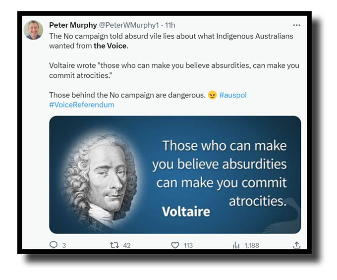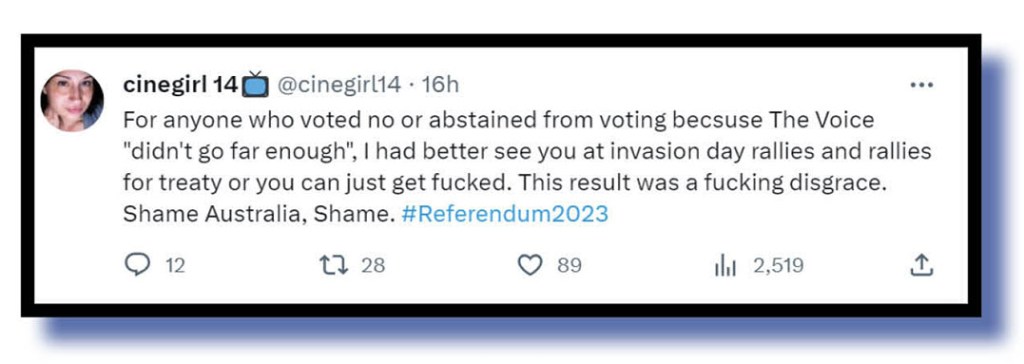 Bee pondered why it’s so bloody hard to change the constitution, cinegirl 14 wished some sexual activity for those No voters who didn’t think the Voice went far enough, and Prof Jenny Hocking YES rightly mocked the No’s frequent chant of “If you don’t know, vote No!
