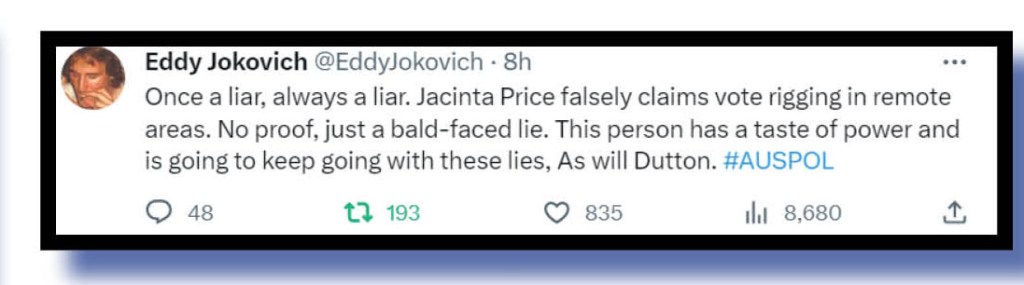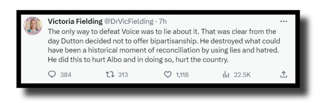 The Bug declares again: what an excellent idea! Let’s shove aside the “we’ve all now got to be nice to each other!” bullshit and get stuck in. The battle was lost; the war is there to be won. It must be won. We’ll let pollies worry about whether they might come across as sore losers. X is full of angry losers and we reckon that’s great! Keep doing the job the mainstream mediocre has willfully abrogated. A MDM, mind, that is almost 100% devoted now to blaming Albanese for the referendum defeat and doing its brown-nosing best to garner votes for Dutton.