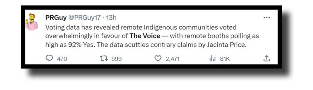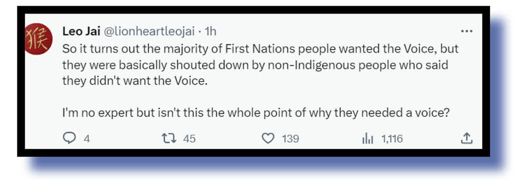 Let’s now look at one of the really big lies of the No campaign and its subliminal message: “Hey, whities, even the darkies are hopelessly divided on the Voice so why should you be stupid enough to support it!”