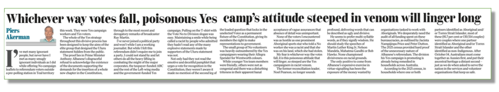 “The whole of the Yes strategy throughout this divisive process has been designed to keep the aims of the elite group that designed the Uluru statement hidden from the public.” Those grubby fucking elites – the whole 250 of them First Nations people – who penned the Uluru statement from the heart!