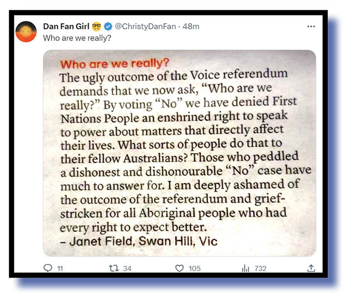 For make no mistake: the No! racists and liars have not let up since October 14. More than that, their nonsense and misinformation has actually stepped up, with the full support of the woeful mainstream mediocre. It’s all Albanese’s fault. He’s clearly wounded. Dutton is the real winner. The Yes campaign was the worst ever and they deserved to lose! Etc, fucking, etc.