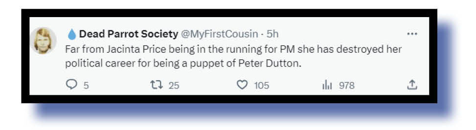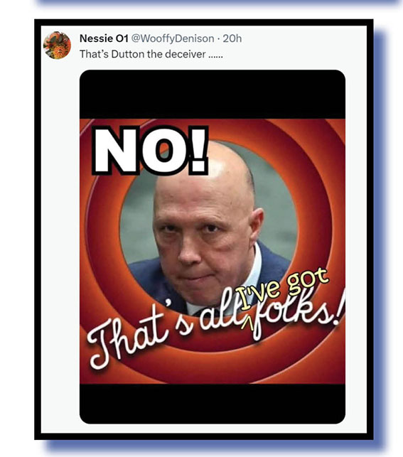 … while Peta Credlin and Pauline Hanson got special mentions from ajgardineresq@threads.net and Rex Patrick respectively…