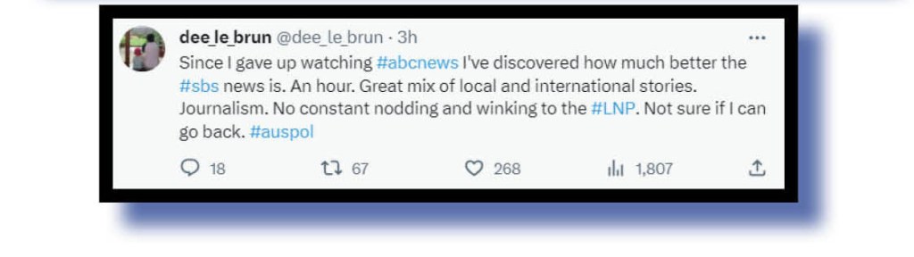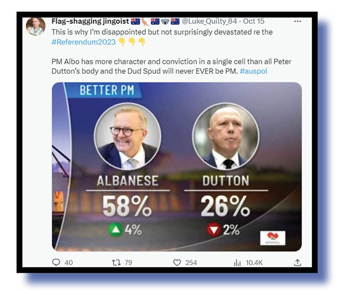 On the general referendum outcome, MFW took a swipe at the mainstream mediocre and Flag-shagging Jingoist took a half-glass-full approach with late polls showing Dutton’s negativity and lies hadn’t helped his own political cause.