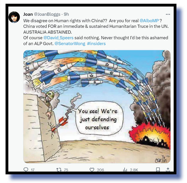We at The Bug know fuck all about the wacky world of geo-politics but think the reason given as to why Australia couldn’t vote for that motion – it didn’t mention the October 7 murderous attacks by Hamas – was wishy-washy at best. Unless of course Albanese knows as well as anyone that Australia really is both racist and zionist. Or as Coalition Tea Lady has opined, was the wine and the tucker on the White House lawn that good? And are our US nuclear subs that vital? Perhaps we should just be grateful that we have a left-wing prime minister (insert loud and prolonged canned laughter here) or we might have voted no!
